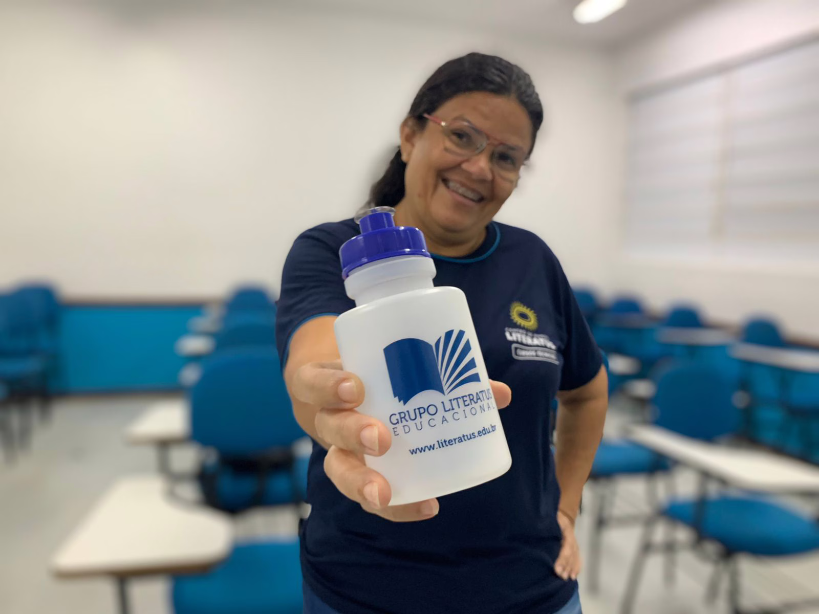 O Grupo Literatus Educacional distribui garrafas do modelo squeeze aos alunos e colaboradores, com o objetivo de reduzir o consumo de copos plásticos, diminuindo assim os resíduos e lixo para o meio ambiente.